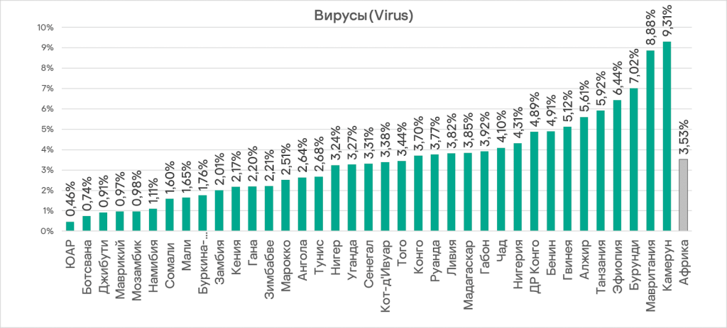 Среди стран региона по доле компьютеров АСУ, на которых блокируются вирусы, лидируют Камерун (9,31%) и Мавритания (8,88%). Наименьший из всех стран показатель в ЮАР — 0,46%.