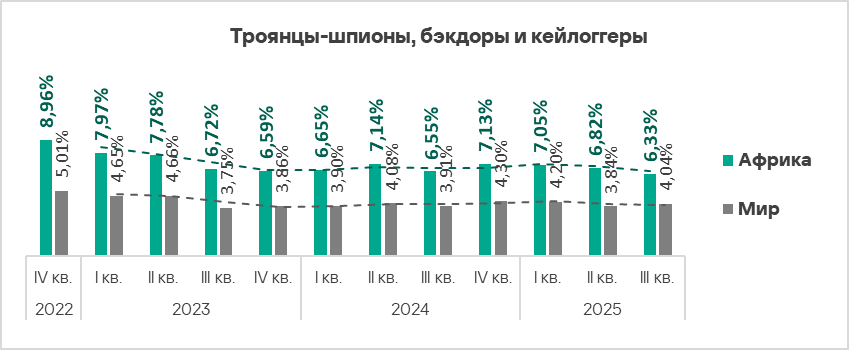 Африка устойчиво лидирует среди регионов по доле компьютеров АСУ, на которых были заблокированы программы-шпионы. В третьем квартале 2025 года этот показатель в Африке уменьшился до 6,33% — это в 4,5 раза больше, чем в Северной Европе, где доля компьютеров АСУ, на которых блокируется шпионское ПО, наименьшая.