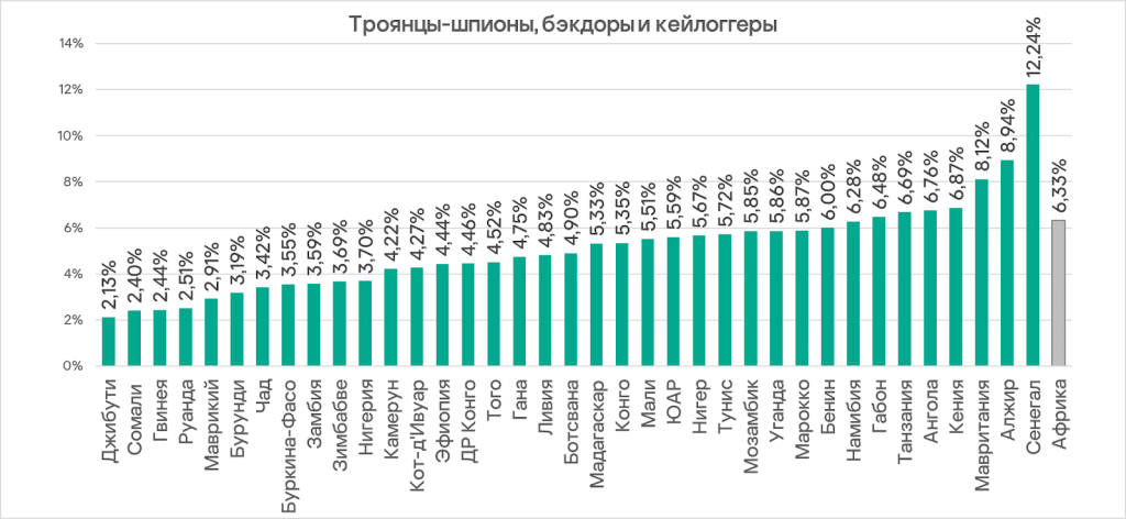 По доле компьютеров АСУ, на которых блокируется шпионское ПО, Африка неизменно лидирует в соответствующем рейтинге регионов.