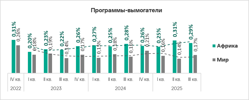 В третьем квартале 2025 года Африка занимает второе место среди регионов по доле компьютеров АСУ, на которых были заблокированы программы-вымогатели с 0,29%. Это в 5,8 раза больше доли региона с минимальным значением — Северной Европы.