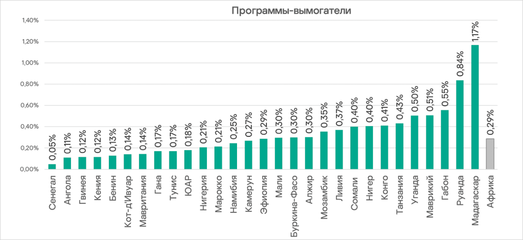 Среди стран региона лидируют по доле компьютеров АСУ, на которых были заблокированы программы-вымогатели, Мадагаскар с 1,17% и Руанда с 0,84%.