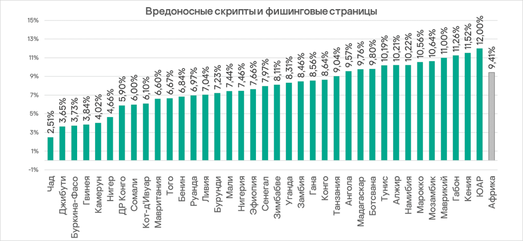 Среди стран региона по доле компьютеров АСУ, на которых были заблокированы вредоносные скрипты и фишинговые страницы, лидирует ЮАР с 12,0%. Эта же страна возглавляет рейтинг по угрозам из почтовых клиентов. Наименьший показатель в Чаде — 2,51%.
