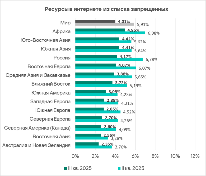 В третьем квартале 2025 года доля компьютеров АСУ, на которых блокируются ресурсы в интернете из списка запрещенных, уменьшилась во всех регионах. По этому показателю Африка сохранила лидирующую позицию с 4,96%. Это в 2,1 раза выше, чем в регионе Австралия и Новая Зеландия, который замыкает соответствующий рейтинг.