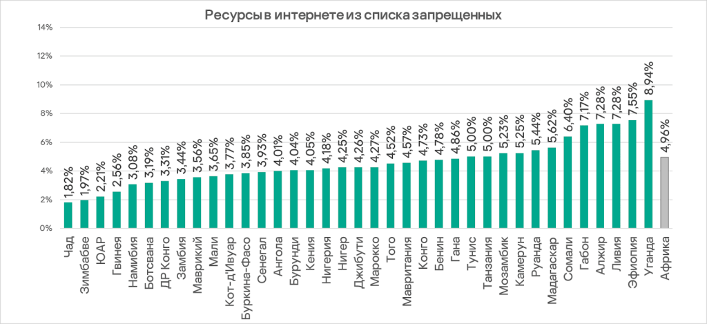 Среди стран региона по доле компьютеров АСУ, на которых блокируются ресурсы в интернете из списка запрещенных, лидирует Уганда с 8,94%. Эта страна также входит в топ-3 стран по доле компьютеров АСУ, на которых блокируются угрозы из интернета. Наименьший показатель в Чаде — 1,82%.