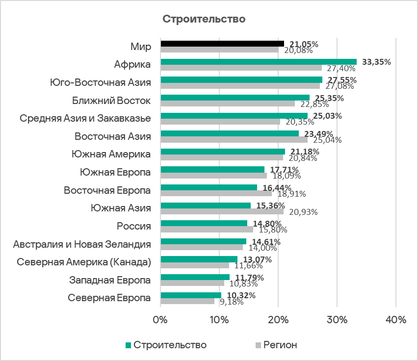В Африке наиболее часто встречающейся с угрозами отраслью среди рассмотренных в отчете по-прежнему является строительство. По доле компьютеров АСУ, на которых в этой отрасли были заблокированы вредоносные объекты, Африка лидирует среди регионов.