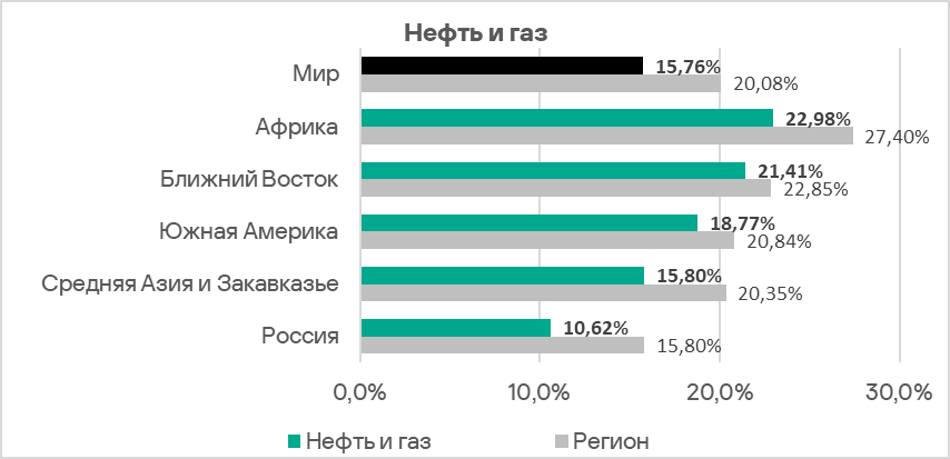 Высокие показатели по типам угроз свидетельствуют о признаках низкого уровня зрелости кибербезопасности промышленных предприятий на континенте — доступности интернет-ресурсов на компьютерах ОТ, слабой защите от фишинга, наличии значительной части незащищенной инфраструктуры и пока еще относительно низком уровне кибергигиены сотрудников.