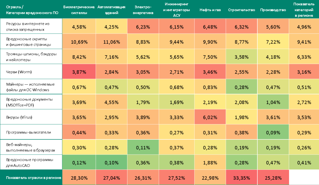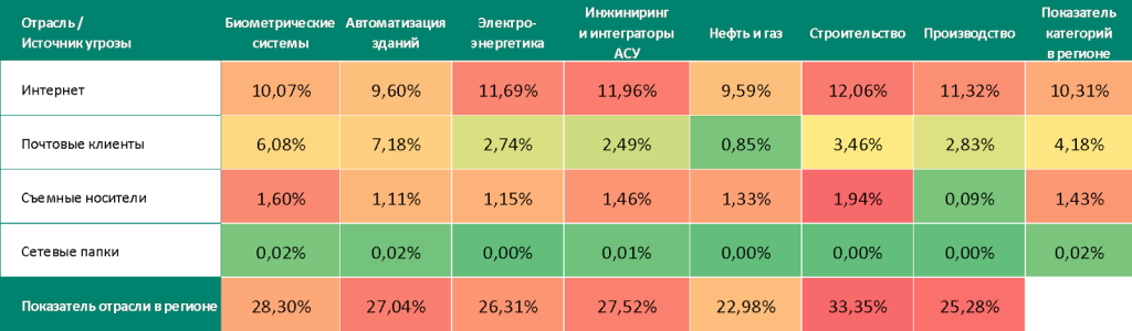 При оценке проблем отраслей в регионах мы используем тепловые карты. Цвет на карте определяет положение показателя в глобальном рейтинге отраслей в регионах (отдельно по каждой категории угроз или каждому источнику). Красный цвет указывает на то, что значение близко к максимальному.