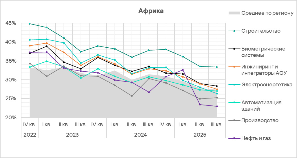 Показатели категорий угроз в отраслях в Африке, III квартал 2025 года