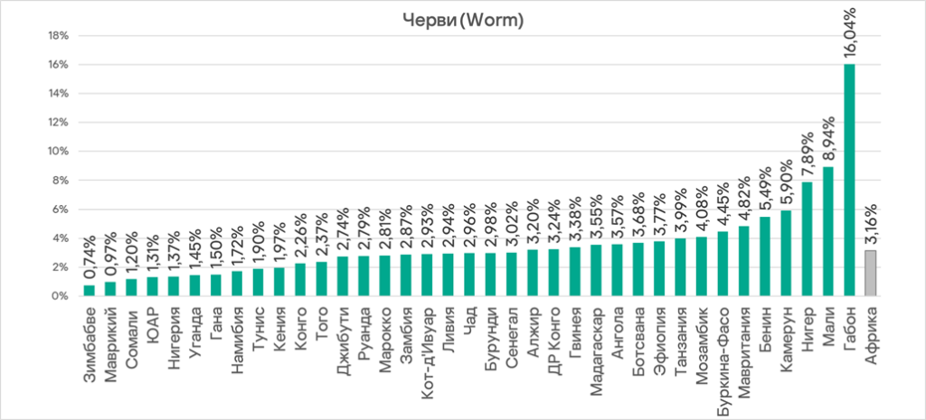 В странах региона по доле компьютеров АСУ, на которых блокируются черви, с большим отрывом лидирует Габон с аномально высокими 16,04%. Это в 1,8 раза больше значения у следующей страны в рейтинге — Мали (8,94%). Наименьший показатель в Зимбабве — 0,74%.