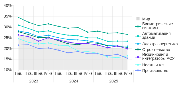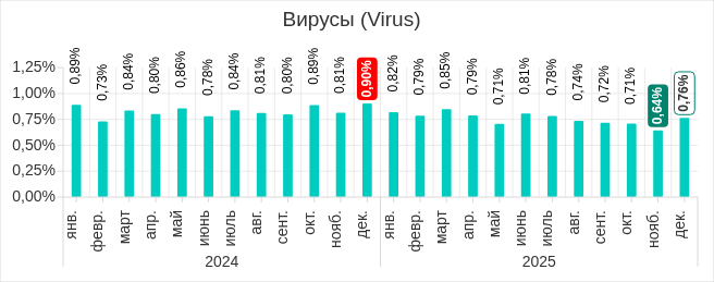 Как и в случае вирусов, максимальное месячное значение показателя было в марте, минимум 2025 года пришелся на ноябрь.