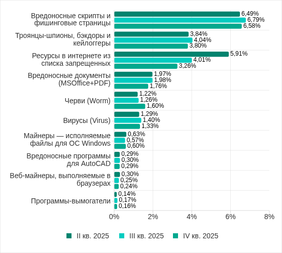 Основные категории угроз из интернета, которые были заблокированы на компьютерах АСУ в четвертом квартале 2025 года: вредоносные скрипты и фишинговые страницы, а также ресурсы в интернете из списка запрещенных.