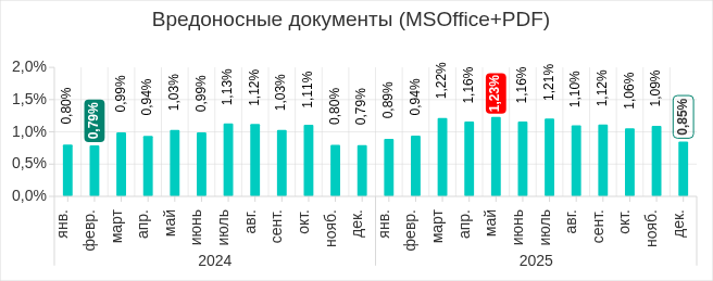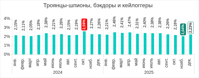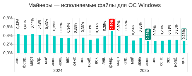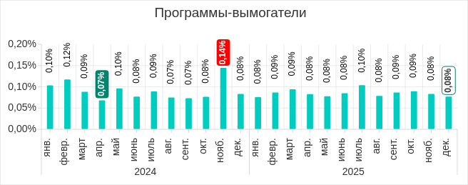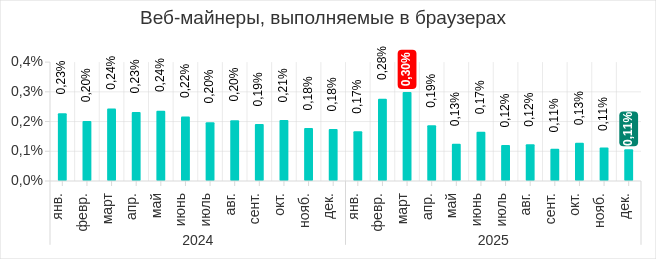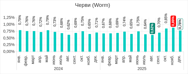 В 2025 году самыми высокими показатели за месяц были в четвертом квартале. В октябре и ноябре, в ходе двух волн фишинговой атаки, показатель рос. В декабре доля компьютеров АСУ, на которых блокировались черви, уменьшилась, однако значение все равно превысило показатели остальных месяцев 2025 года.