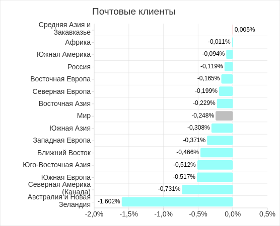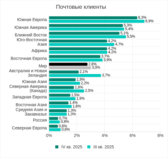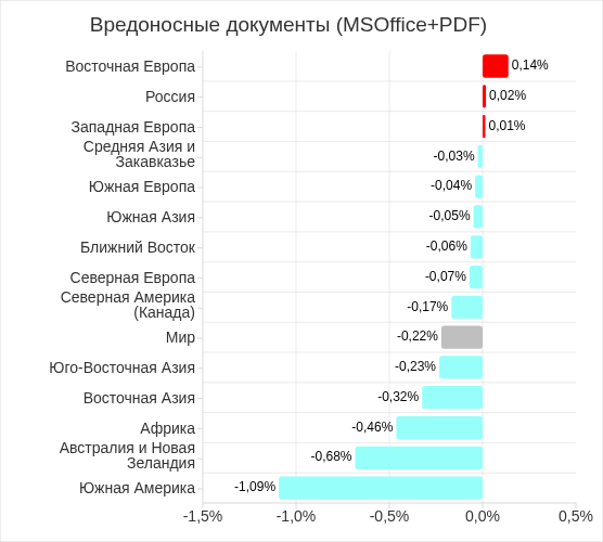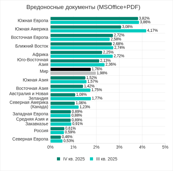 Состав топ 3 регионов по уровню угроз из почтовых клиентов не изменился. В него вошли: Южная Европа, Южная Америка и Ближний Восток.