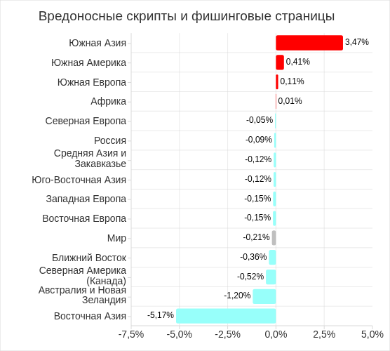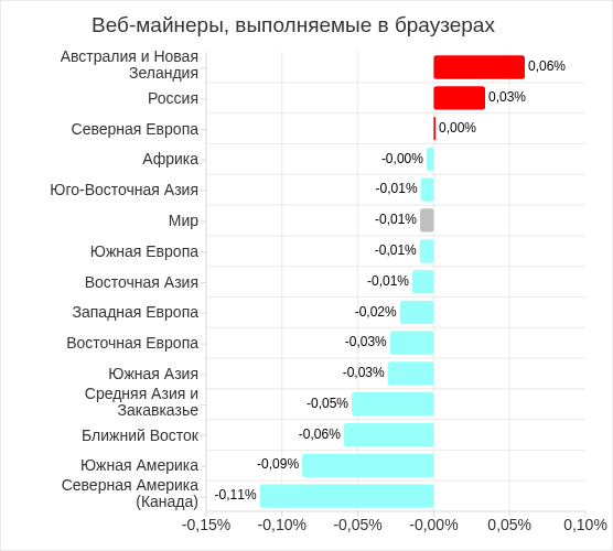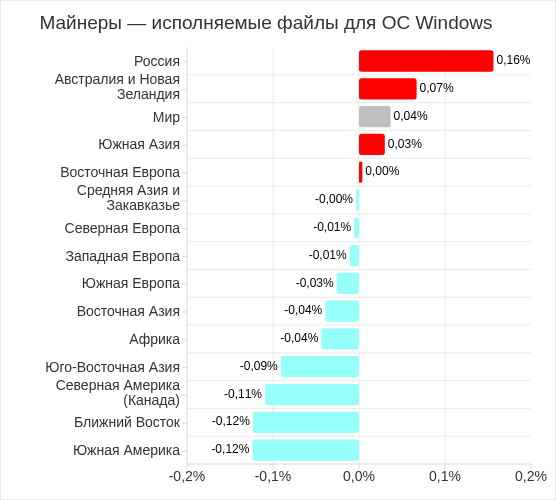 В регионах доля компьютеров АСУ, на которых были заблокированы веб-майнеры, выполняемые в браузерах, варьирует от 0,06% в Восточной Азии до 0,34% в Юго-Восточной Азии. Топ 3 регионов по этому показателю: Юго-Восточная Азия, Южная Америка и Африка.