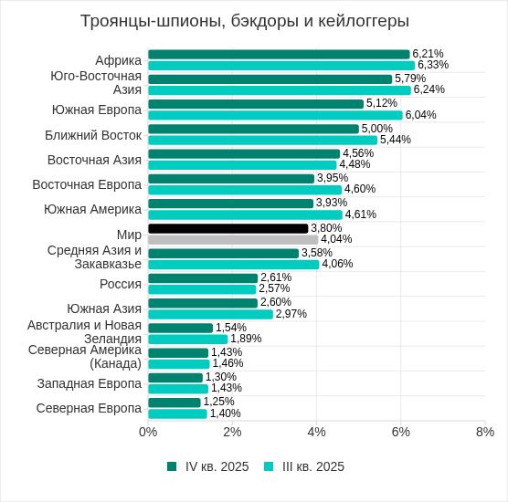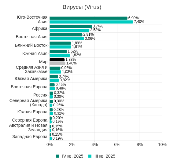 Доля компьютеров АСУ, на которых были заблокированы вирусы, в четвертом квартале 2025 года увеличилась в четырех регионах: в Африке, Северной Америке (Канада), России и Северной Европе. Больше всего показатель увеличился в Африке.