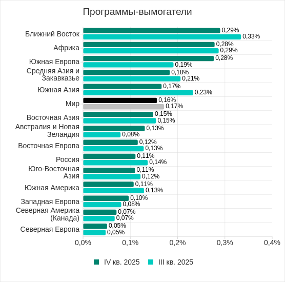 Топ 3 регионов по доле компьютеров АСУ, на которых в четвертом квартале 2025 года были заблокированы угрозы из интернета, остался прежним: Южная Азия, Юго-Восточная Азия и Африка. При этом два региона поменялись местами – Африка опустилась на третье место, Южная Азия поднялась с третьего на первое.
