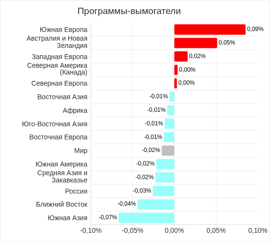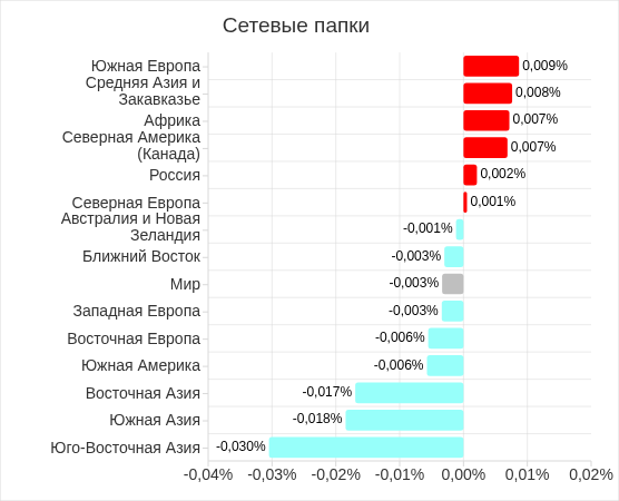 Топ 3 регионов по уровню угроз в сетевых папках: Восточная и Юго-Восточная Азия, Ближний Восток. Восточная Азия традиционно лидирует по этому показателю с большим отрывом от остальных регионов.