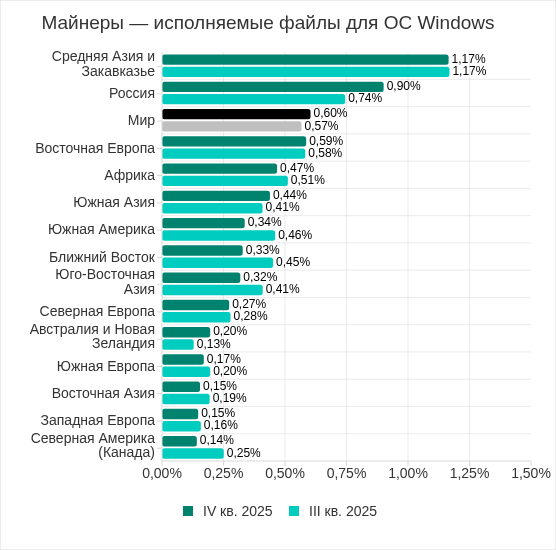 В четвертом квартале 2025 показатель угроз в сетевых папках вырос в шести регионах, больше всего — в Южной Европе и в Средней Азии и Закавказье.