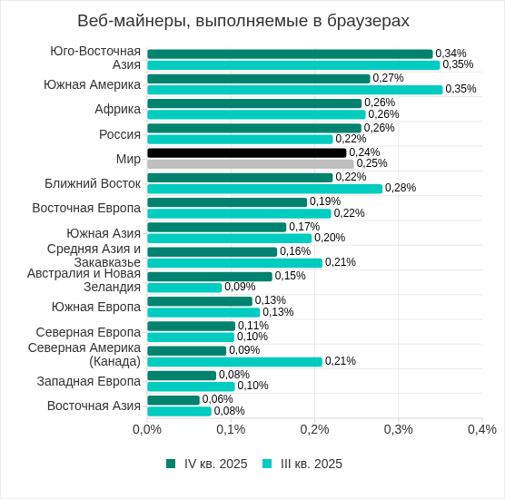 В четвертом квартале 2025 года доля компьютеров АСУ, на которых были заблокированы веб-майнеры, увеличилась в трех регионах — Австралии и Новой Зеландии (в 1,67 раза), России и Северной Европе. В Австралии наиболее заметный рост показателя за квартал отмечен в отрасли автоматизация зданий — с 0,09% до 0,26%, почти в три раза.