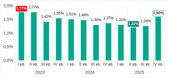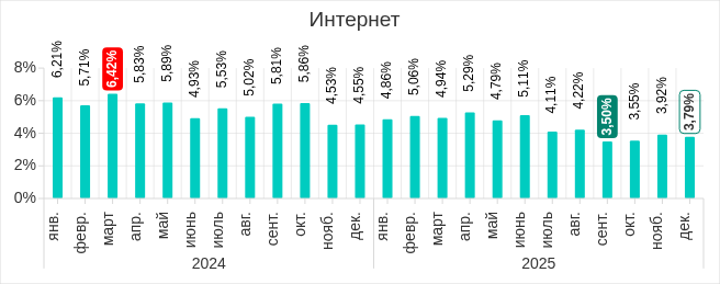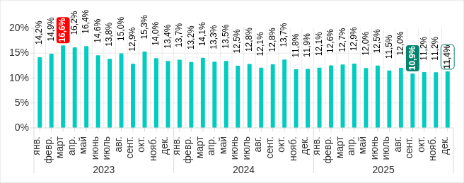 В 2025 году наибольшее месячное значение показателя было в марте. Минимум пришелся на ноябрь, в декабре показатель вырос.