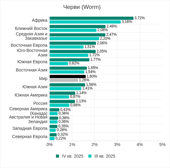 В четвертом квартале 2025 года во всех регионах мира выросла доля компьютеров АСУ, на которых были заблокированы черви (worms) в почтовых вложениях.