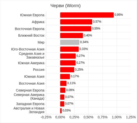 В регионах доля компьютеров АСУ, на которых были заблокированы черви, варьирует от 0,32% в Северной Европе до 3,72% в Африке. В тройку регионов, лидирующих по этому показателю, по-прежнему входят Африка, Ближний Восток, Средняя Азия и Закавказье.