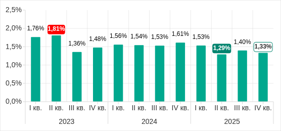 Доля компьютеров АСУ, на которых были заблокированы вирусы, в четвертом квартале 2025 года уменьшилась до 1,33%.