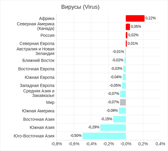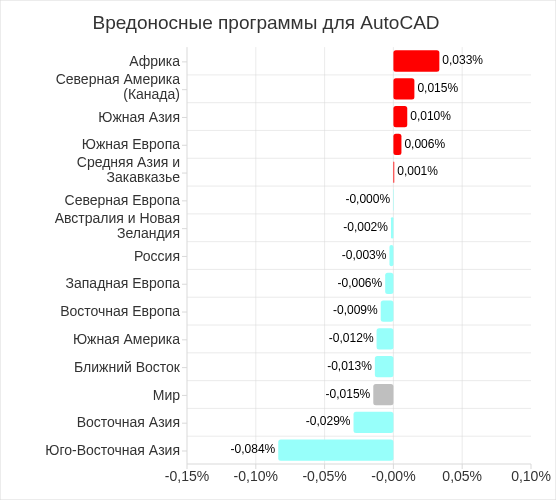 В регионах доля компьютеров АСУ, на которых были заблокированы вирусы, варьирует от 0,15% в Западной Европе до 6,90% в Юго-Восточной Азии. Топ 3 регионов по этому показателю не изменился: Юго-Восточная Азия (с большим отрывом от остальных), Африка и Восточная Азия, Эти же регионы входят в список лидеров и в случае вредоносных программ для AutoCAD.