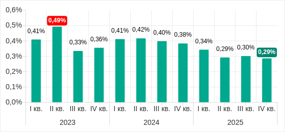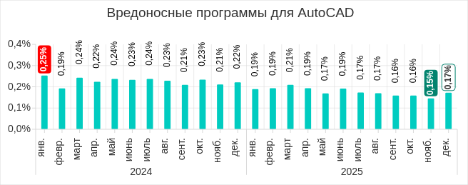 В четвертом квартале 2025 года доля компьютеров АСУ, на которых было заблокировано вредоносное ПО для AutoCAD, после роста в предыдущем квартале вновь уменьшилась до 0,29%.
