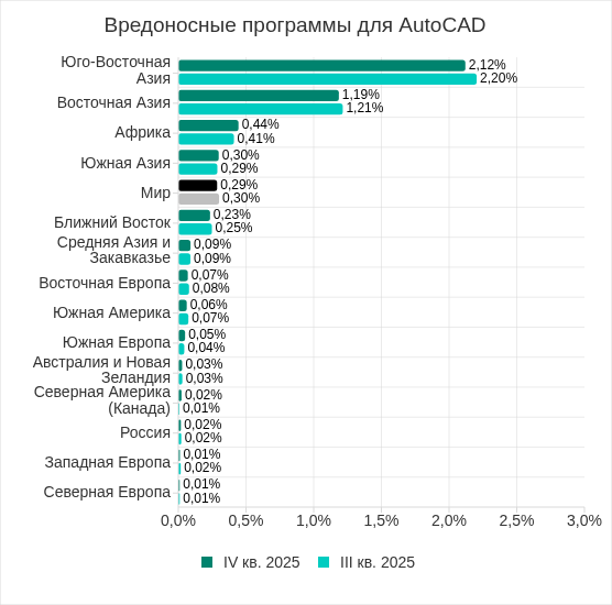 Показатель вредоносных программ для AutoCAD в четвертом квартале 2025 года увеличился в пяти регионах, больше всего — в Африке.