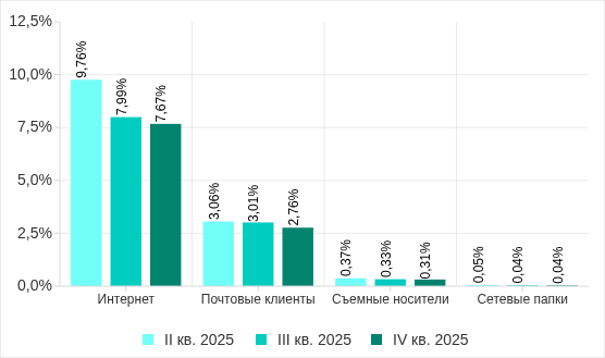 Основными источниками угроз для компьютеров в технологической инфраструктуре организаций по-прежнему остаются интернет, почтовые клиенты и съемные носители. В четвертом квартале 2025 года показатели всех источников угроз, кроме почтовых клиентов, оказались наименьшими с 2022 года.