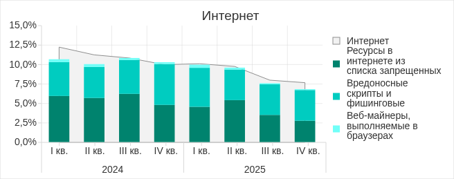 В четвертом квартале 2025 года доля компьютеров АСУ, на которых были заблокированы угрозы из интернета, уменьшилась до 7,66% — это наименьший показатель с начала 2023 года.