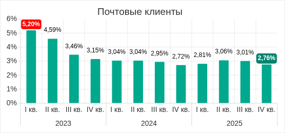 Доля компьютеров АСУ, на которых были заблокированы угрозы из почтовых клиентов, с начала 2024 года относительно стабильна. Показатель четвертого квартала 2025 года — 2,76% — чуть выше, чем минимальное с 2022 года значение 2,72%, отмеченное в четвертом квартале 2024 года.