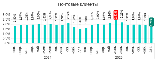 Месячные показатели демонстрируют явную тенденцию к снижению. В 2025 году наибольшее значение было отмечено в апреле, минимум пришелся на ноябрь.