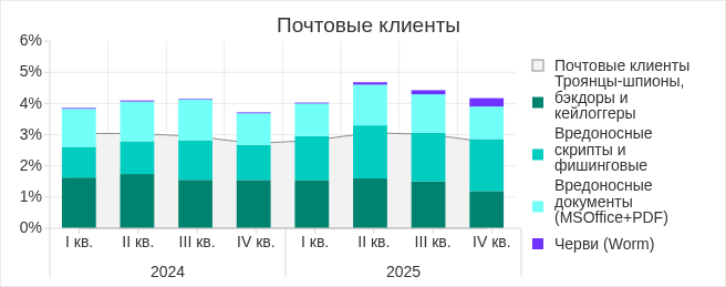 Основные категории угроз из электронной почты, заблокированные на компьютерах АСУ в четвертом квартале 2025 года, — это вредоносные скрипты и фишинговые страницы, шпионское ПО и вредоносные документы. На диаграмме также виден рост в четвертом квартале 2025 года доли компьютеров, на которых были заблокированы черви из почтовых клиентов.