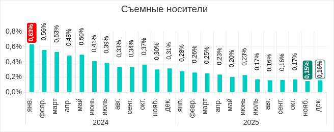 Доля компьютеров АСУ, на которых угрозы были обнаружены при подключении съемных носителей, продолжила снижаться и достигла минимального значения с начала 2023 года — 0,31%.