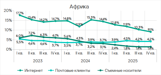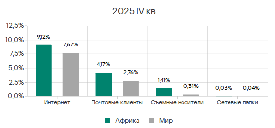 В четвертом квартале 2025 года значения по всем источникам угроз, кроме сетевых папок, в регионе среднемировые. В случае съемных носителей это превышение весьма значительно — в 4,5 раза. Показатель угроз из интернета в Африке выше среднемирового в 1,2 раза, почтовых клиентов — в 1,5 раза.