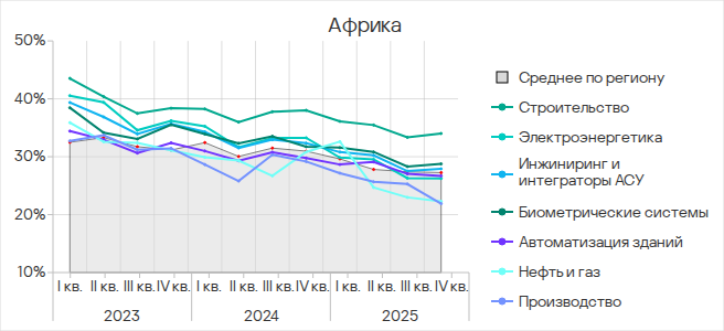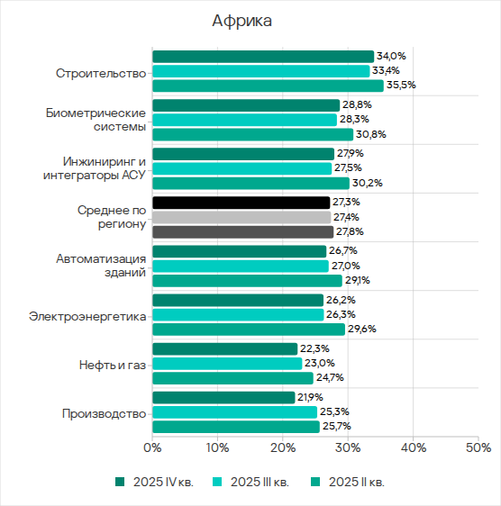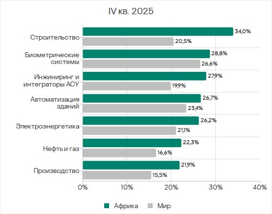Показатели категорий угроз в отраслях в Африке, IV квартал 2025 года
