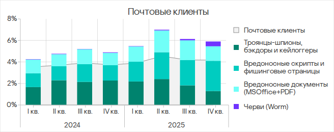 Доля червей, источником которых стали почтовые клиенты, в четвертом квартале 2025 года заметно выросла. Это обусловлено очередной волной фишинговых кампаний, известных как Curriculum-vitae-catalina, в ходе которых жертвам рассылались фишинговые письма с вредоносным вложением (червь-бэкдор Backdoor.MSIL.XWorm), замаскированным под резюме. Пик атак в Африке пришелся на ноябрь.