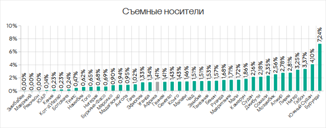Среди стран региона по доле компьютеров АСУ, на которых были заблокированы угрозы при подключении съемных носителей, с большим отрывом лидирует Бурунди с 7,24%. Показатели остальных стран варьируют от 0,14% в ЮАР до 3,37% в Габоне.