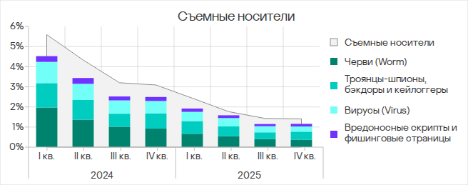 Основные категории угроз, которые в четвертом квартале 2025 года были заблокированы при подключении съемных носителей к компьютерам АСУ: шпионское ПО, черви и вирусы. По доле компьютеров АСУ, на которых блокировались шпионские программы и черви, Африка также лидирует среди регионов, в рейтинге по вирусам она находится на втором месте.