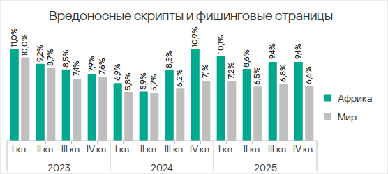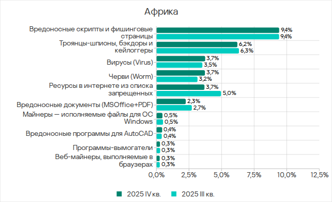 В третьем квартале 2025 года Африка поднялась с четвертого на первое место в рейтинге регионов по доле компьютеров АСУ, на которых блокируются вредоносные скрипты и фишинговые страницы. В четвертом квартале показатель чуть подрос — с 9,41% до 9,42%, но при этом Африка оказалась на третьем месте в этом рейтинге.