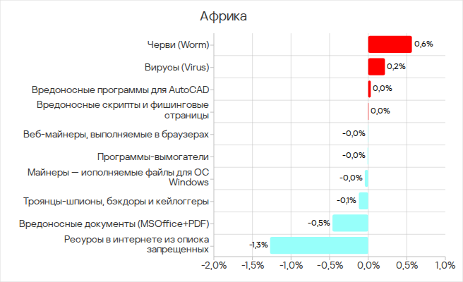 Несмотря на явный тренд к снижению доли компьютеров АСУ, на которых были заблокированы угрозы со съемных носителей, по этому показателю Африка по-прежнему с большим отрывом лидирует среди регионов с 1,41%. Показатель Африки превышает показатель региона Австралия и Новая Зеландия, который занимает последнее место в соответствующем рейтинге, в 28,2 раза.