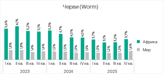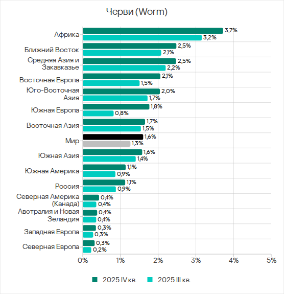 В четвертом квартале 2025 года в Африке доля компьютеров АСУ, на которых блокируются черви, выросла до 3,72%. По сравнению с Северной Европой, которая замыкает соответствующий рейтинг регионов, значение выше в 11,6 раза.