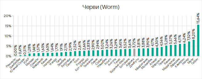 В странах региона по доле компьютеров АСУ, на которых блокируются черви, с большим отрывом лидирует Габон с аномально высоким показателем 15,64%. Это значение в 1,9 раза больше, чем у следующей страны в рейтинге — Мали (8,20%). Наименьший показатель — в Зимбабве (0,47%).