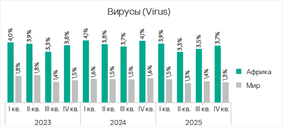В четвертом квартале 2025 года Африка занимает второе место среди регионов по доле компьютеров АСУ, на которых были заблокированы программы-вымогатели с 0,28%. Это в 5,6 раза больше доли региона с минимальным значением — Северной Европы.