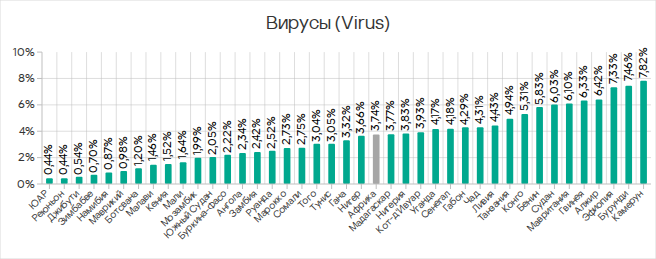 Среди стран Африки по доле компьютеров АСУ, на которых блокируются вирусы, лидирует Камерун с 7,82%. Наименьший показатель — в ЮАР (0,44%).
