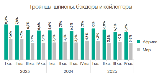 Среди регионов в четвертом квартале 2025 года Африка лидирует в рейтингах по доле компьютеров АСУ, на которых были заблокированы шпионские программы и черви.
