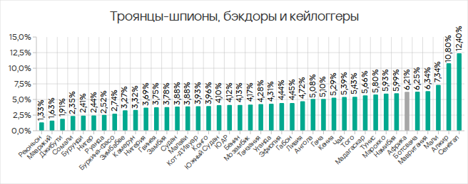 Среди стран региона по доле компьютеров АСУ, на которых были заблокированы программы-шпионы, с отрывом лидируют Сенегал с 12,40% и Алжир с 10,8%. Наименьший показатель — на Маврикии (1,63%).