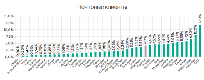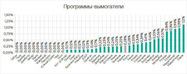 Среди стран региона по доле компьютеров АСУ, на которых угрозы были заблокированы в почтовых клиентах, лидирует ЮАР с 11,60%. Минимальный показатель — в Буркина-Фасо (0,3%).